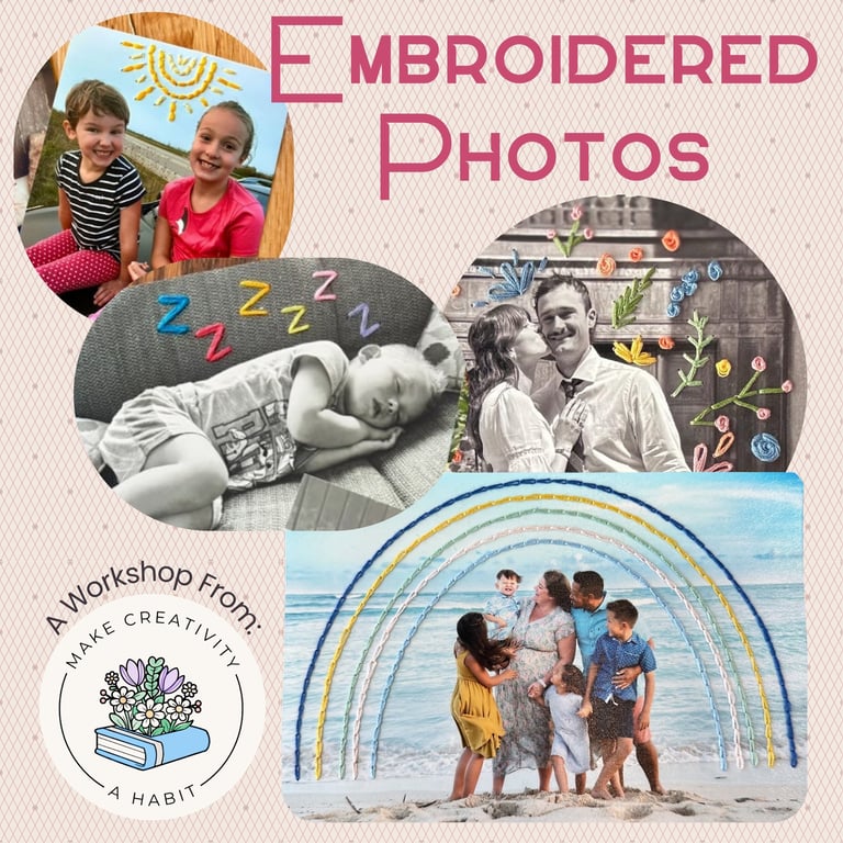 Embroidered photos are a great way to explore creativity through the process of using embroidery in a non-traditional way! No embroidery experience needed! We'll learn and use simple stitches for big impact. More advanced stitch ideas and demos will also be provided. Bring a few photos - photo paper is just fine - no special paper needed. Practice photos will be provided.