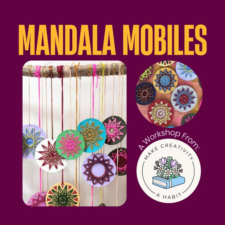 Create colorful, woven mandala stars from cardstock, ribbon, threads, and yarn. Hang your creations from a Willow branch. Create many woven mandala stars for a full mobile!
