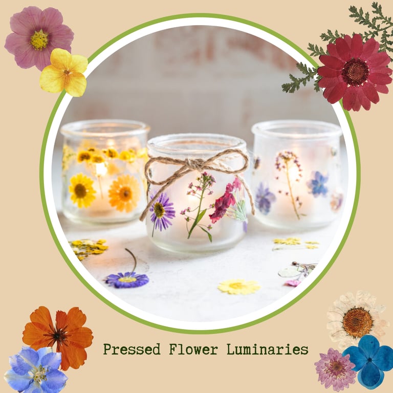 Capture a piece of summer and enjoy the candle-lit glow of pressed flower luminaries as a reminder of nature’s beauty! Make a set of glass luminaries using pressed wildflowers and additional embellishments. Light your luminaries with electric or wax candles and remember the summer sunshine in the middle of winter!