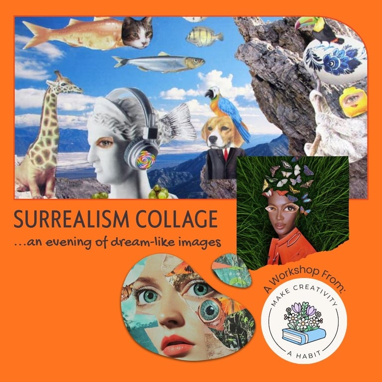 Step into the dreamlike world of surrealism in this collage workshop where imagination knows no bounds! Using images from magazines and books, create thought-provoking collage that blends the unexpected and uncanny. You'll learn basic collage techniques, composition tips, and how to harness juxtaposition to craft artworks that challenge logic and spark curiosity. Whether you're a seasoned artist or just looking to try something new, this workshop is open to all skill levels. All materials provided—just bring your curiosity and a willingness to dive into the bizarre and beautiful!